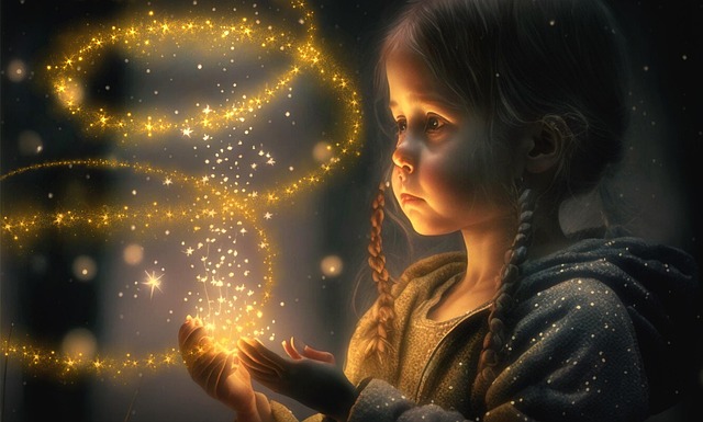 A young girl with braided hair gazes in awe as she holds shimmering golden sparkles in her hands, surrounded by a mystical swirl of light.